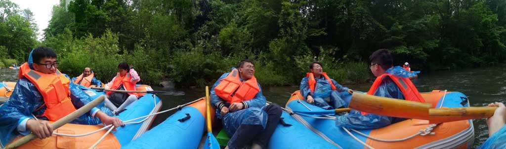 位于长白山腹地的露水河国家森林公园里,流淌着一条一年四季恒温的温泉河,当地人称之为“碧泉河”、“不冻河、天然矿泉河”。河水发源于温泉性质的碧泉湖。碧泉湖由温泉湖形成,温度长年在7℃至8℃,三九隆冬也不冻,成为独特的冬季水文景观,即使冬天可以漂流,景色也格外漂亮,号称是“东北第一漂”。 小伙伴们下了车,买了雨衣,迫不及待的自己分组两人一组驾一叶皮筏漂流了。10多米宽的河面上荡漾着一层薄薄的雾纱。顺着疾驰的河水漂流而下,感觉皮筏漂得特别快。一路浪花四溅、微风拂面。远望迢迢山岚,河两岸是茫无边际的林海,能看到藏身林海深处的各种红松王、沙松王。依依碧水勾起一分遐思,试探的把手伸进去,冰凉的感觉很愉悦。小皮筏在曲折的河中跌宕起伏,我们笨拙的在林间划着,不时有险情的样子,小伙伴们有点小小的波动就开怀尖叫,有一种在原始密林中探险的感觉。欢笑之余,感激大自然的恩赐带来畅快的惊险漂流。