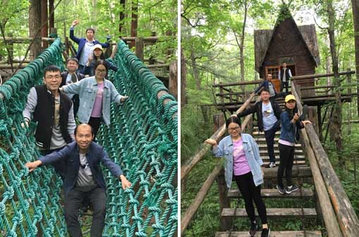 从皮筏上头轻脚重下来,乘坐景区电瓶车来到沐氧园,这是森林观赏和林间漫步的好地方,园内古木参天,红松、水曲柳、柞树、紫椴等珍贵树种让人目不暇接。 园内还建有梅花桩、独木桥、蜘蛛桥、木索桥、林间高空秋千等各种设施,我们尝试每个项目探险,不停地拍照,欢笑之余增添了无限情趣。