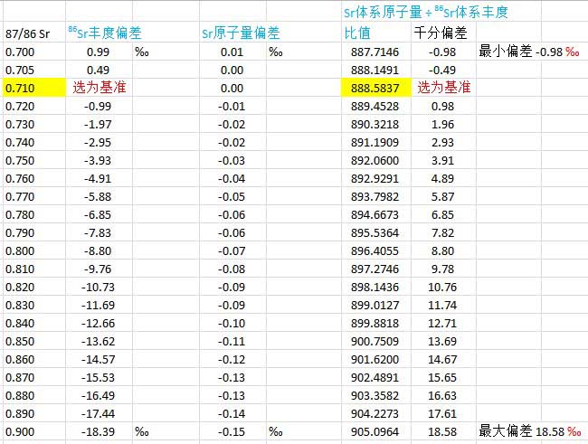 计算该比值偏差 的近似公式 = [原子量偏差] 减去 [86Sr丰度偏差]