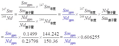 根据实践经验,由Sm-Nd同位素稀释法计算得到的147Sm/144Nd比值,其不确定度介于5‰~10‰。通过上表计算,放射性成因143Nd*的丰寡对体系内 [Nd原子量÷144Nd丰度]这一比值的影响不超过0.34‰,因此不用考虑放射性衰变效应。